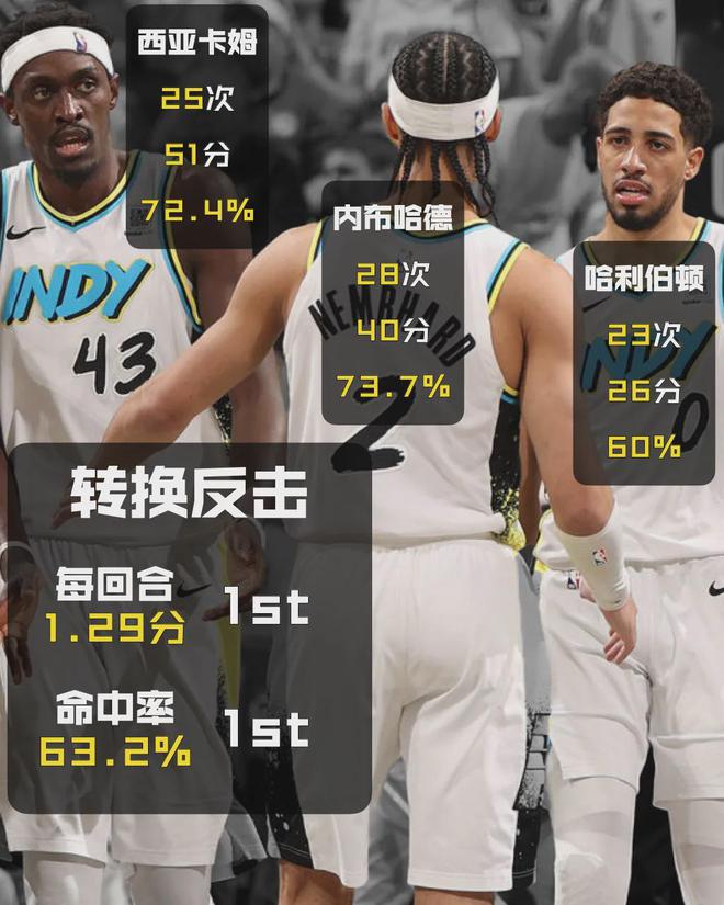 尽管季后赛的对抗强度和赛程密度都提升了一个层级,但步行者仍然守住了自己的优势区,打出自己常规赛引以为傲的奔放篮球。甚至经过对跑轰体系进一步的打磨和执行,他们在季后赛的输出效率要超过常规赛,属于是离谱他妈给离谱开门——离谱到家了。