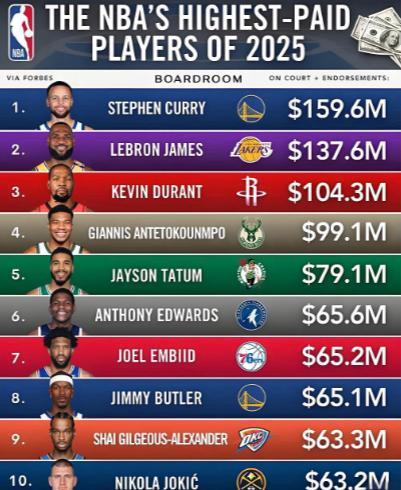 即便詹姆斯的商业帝国也已经全面铺开,但在2025年,吸金第一人还是给到了库里。根据统计,2025年库里的总收入高达1.596亿美元,其中NBA场上薪资5960万,场外代言和投资收益突破1亿美元。